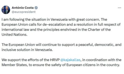 Европската унија повикува на воздржаност и на почитување на принципите на меѓународното право и на Повелбата на ОН во Венецуела, порача денеска високата претставничка на ЕУ...