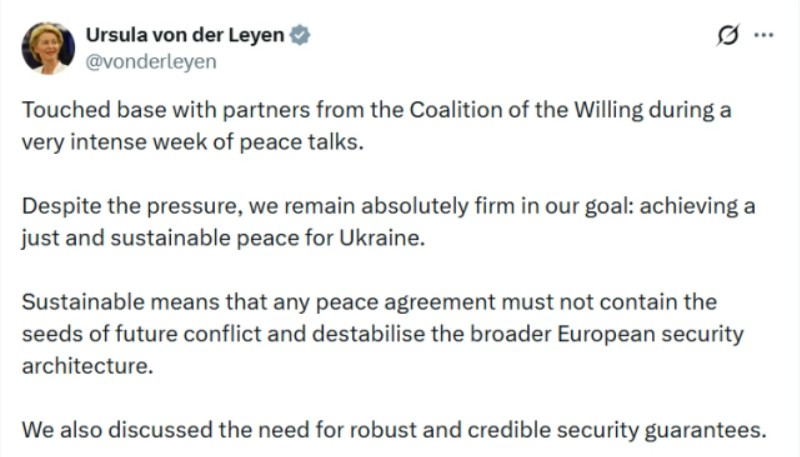 Претседателката на Европската комисија, Урсула фон дер Лајен, денеска соопшти дека разговарала со партнерите од таканаречената „Коалиција на подготвените“ за ставање крај на војната во Украина...