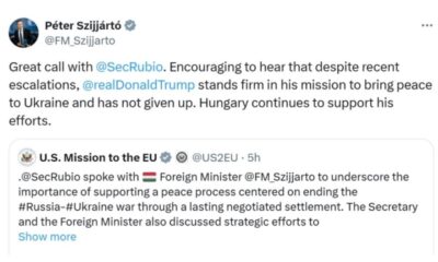 Унгарскиот министер за надворешни работи, Петер Сијарто, го оцени како „одличен“ телефонскиот разговор што денеска го имаше со американскиот државен секретар, Марко Рубио, за напорите за...
